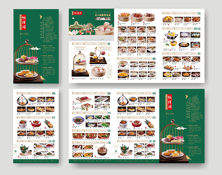 不同的點心茶樓,品牌特性不同,產品數量也不同,定位人群也略有差異,版式編排及文案風格都會有所不同。