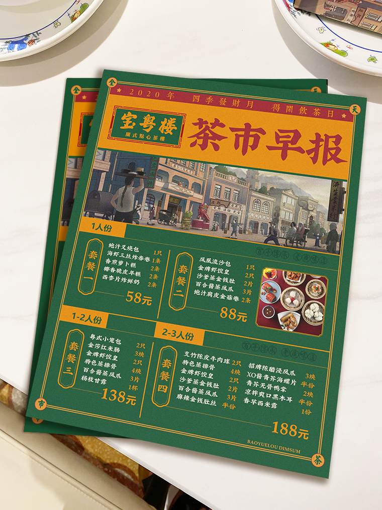 寶粵樓:百年傳承的老廣味道,點心單除了具備點餐的功能,還應表達品牌歷史和底蘊。寶粵樓的茶樓市井氣息濃厚,點心單只選取部分產品圖片,刻意傳達一種古舊的老茶樓氣息;茶市早報的創意設計,則將老廣人嘆早茶,看報紙的生活場景再次還原,極有趣味性之余更把品牌帶入歷史年代中。