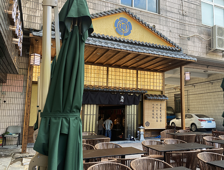 2020年品深餐飲設計全案策劃設計玉椿燒鳥居酒屋,將品牌定位與日本江戶時代的京都風格燒鳥主題居酒屋,門頭招牌使用了經典的江戶時代京都古建筑的屋檐造型,屋檐下方墻體則使用了現代感十足的玻璃磚,在燈光照耀下,晶瑩剔透,非常醒目漂亮,一時之間迅速成為
