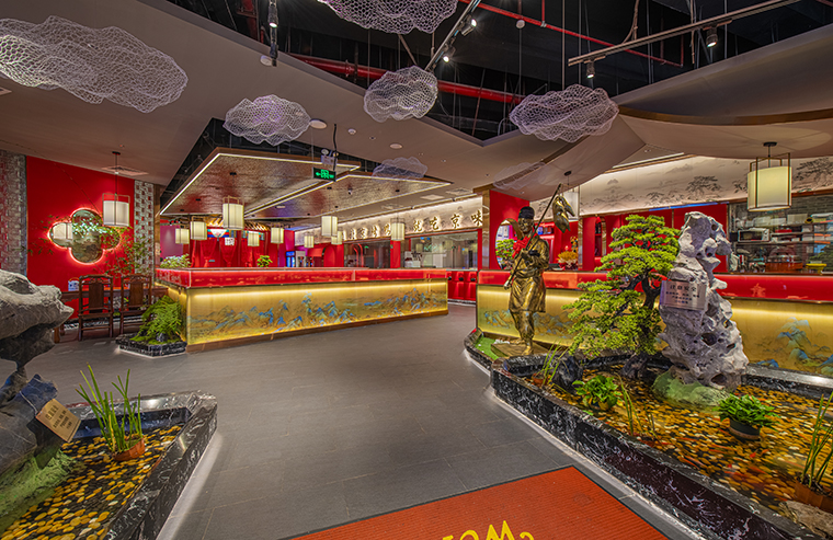 京味張的空間裝飾設計大量借鑒了中式園林造景手法,一步一小景、三步一大景,步移景異。用中國紅強化品牌內含的北京皇城文化,令人印象鮮明;門口的迎賓人,提籠遛鳥人,跑堂人等雕塑銅人將老北京烤鴨飲食文化自然帶出;中式園林造景手法,點綴綠植,水景,框景,步移景異;天花的不銹鋼波紋板,一朵朵的祥云裝飾;矮隔斷的千里江山中國山水工筆畫造型裝飾,仿佛流動的山水國畫;立面的水晶玻璃磚,暗藏燈帶的玻璃隔斷,空間中各種不銹鋼收邊條,明檔上的不銹鋼背發光字,現代裝飾材料與經典美食交相輝映,經典不失時尚。
