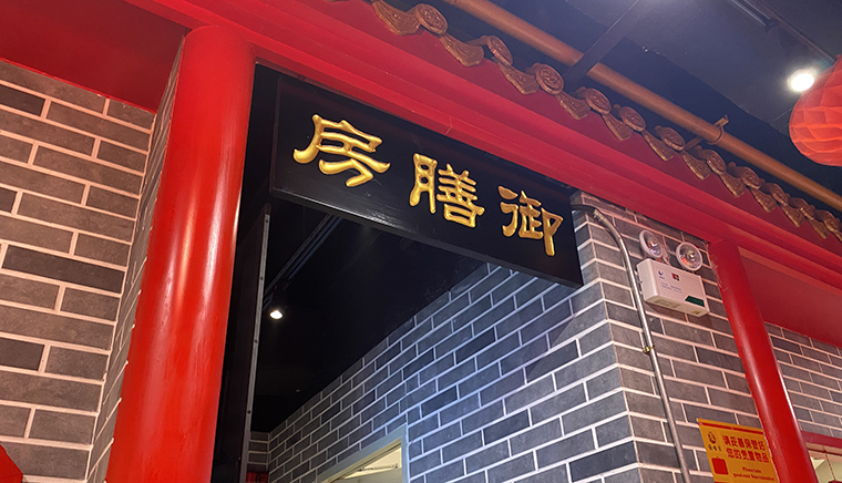 餐廳的地面材料使用的是灰色仿古磚,仿老北京四合院地面灰磚,防滑耐臟,易打理。立面大量使用故宮紅色基底漆涂料,顏色鮮明,極具北京故宮特色;