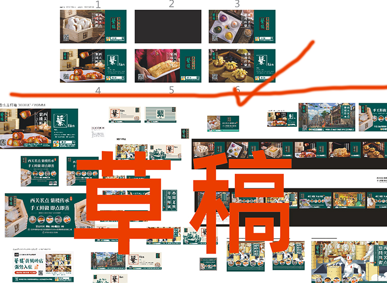 此次海報設計有六個連續畫面,正好適合推廣明星款產品。因蘩樓的產品本身就有較強的藝術美感及傳頌效果,綜合店長及蘩樓主廚師建議,我們選取了6款產品來作為本次海報主題畫面,每一款海報主推一款明星產品,以連續陣列式畫面排開,顧客路過通過6個重復品牌畫面+強調明星產品的形式,視覺震撼,很容易形成對蘩樓的品牌記憶。