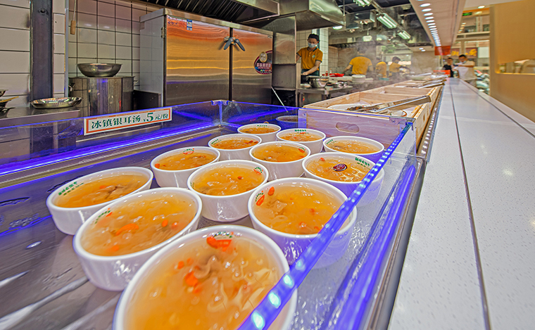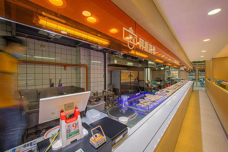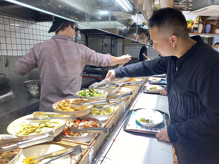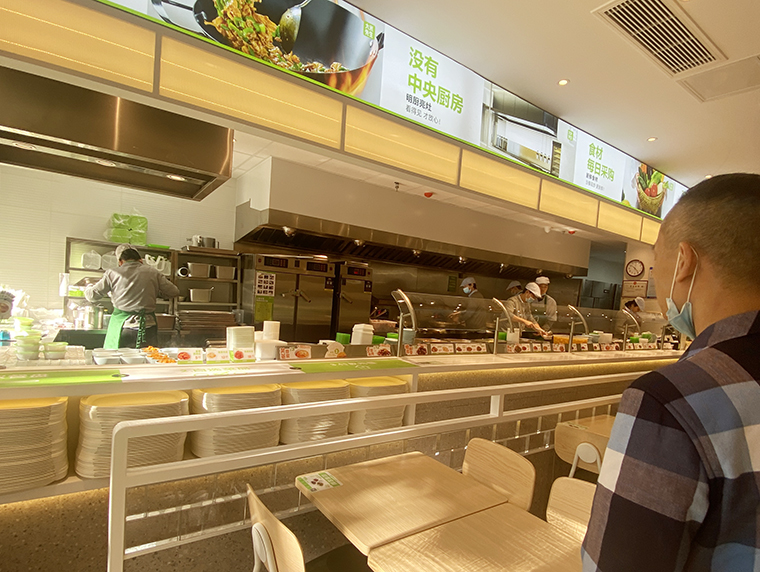 顧客進門洗手,取餐盤自助選菜,找位置就餐,餐具回收,整個動線清晰流暢,運作一氣呵成。選菜臺的設(shè)計非常驚艷,30多到菜品排列成一行,在燈光照射,非常有吸引力。讓消費者產(chǎn)生一種想全部吃一遍的沖動,進而胃口大開,長期光顧我們。