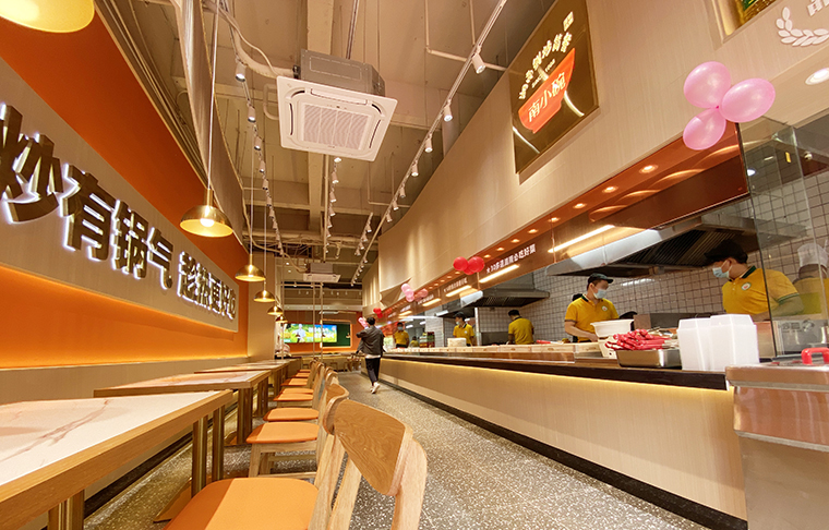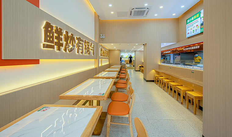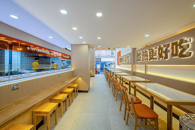 門口大面積落地玻璃、墻面使用板材、白色大理石打菜臺、灰色地面、木色桌面,橙色亞克力板。整個空間追求明亮、整潔、舒適的視覺感受。尤其是門口的落地玻璃,窗明幾凈,讓路過的消費者都能看見店內(nèi)熱火朝天的狀態(tài),鍋氣繚繞的煙火氣,產(chǎn)生強烈的進店沖動。