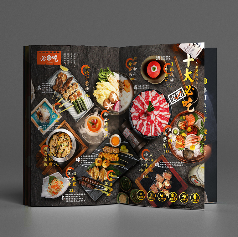 菜單的封面是顧客第一眼看到的內(nèi)容,是顧客第一印象,最容易記住。封面是突出餐廳的品牌還是凸顯招牌菜品?這都需要通盤考慮!品深餐飲設(shè)計建議折頁型菜單拿出一個版面作為封面。如果是新品牌門店,封面主打品牌信息;如果是經(jīng)營多年的老店,封面不妨以近期新研招牌菜主打!