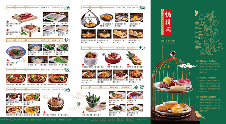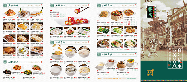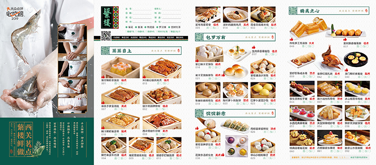菜單價格避免使用常規(guī)排版版式,盡量弱化代替,將價格數(shù)字縮小,金錢標(biāo)志¥20簡化為20.價格后面標(biāo)明菜品的單位。價格代替,例如品深設(shè)計做的悅得閑、寶粵樓、蘩樓等廣式點心的菜單,都不放價格,用小點、大點、中點、特點、頂點、超點、精點、佳點、優(yōu)點來代替。在底部統(tǒng)一將小點、大點、中點、特點、頂點、超點、精點、佳點、優(yōu)點標(biāo)上價格。菜品與價格隔離就會減少價格對顧客的影響,不經(jīng)意間放大了顧客的消費金額。
