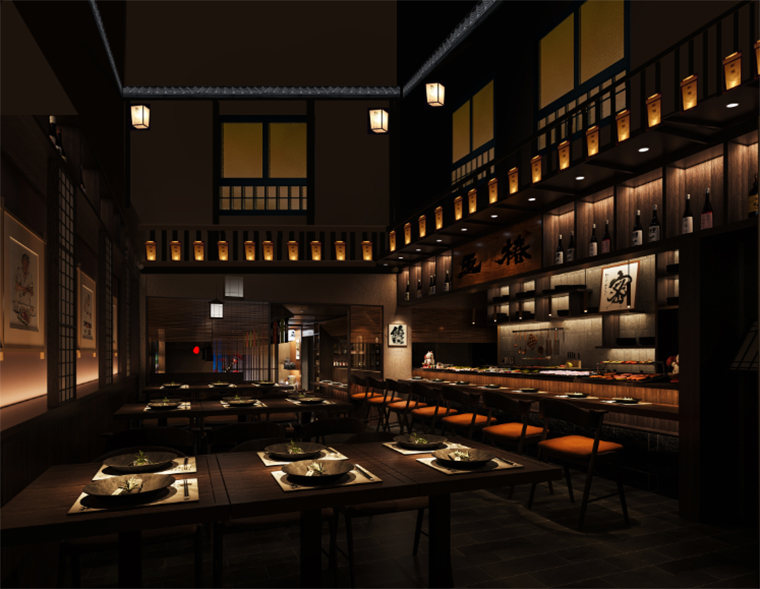 日本料理燒鳥居酒屋餐廳平面布局設(shè)計,日本料理空間裝飾效果圖設(shè)計,燒鳥居酒屋空間施工圖設(shè)計,居酒屋空間軟裝陳列設(shè)計,品牌文化植入空間策劃設(shè)計