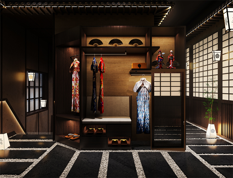 二樓除了必備的洗手間、儲物柜外,還設(shè)置了和服展示區(qū),這是餐飲娛樂化的一大重要趨勢。很多女性消費者在日本料理店消費時喜歡穿著和服自拍分享,彰顯個性也很有趣味,可以很好地把我們玉椿品牌傳播出去。品深餐飲設(shè)計就順應(yīng)這種潮流趨勢,擁抱變化,主動設(shè)置拍照打卡區(qū),讓消費者傳頌。