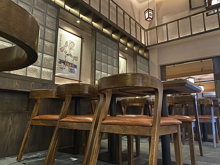 為了營造京都風(fēng)格的空間感受,品深餐飲為玉椿設(shè)計定制的家具采用了實木材質(zhì),開放漆做舊工藝處理,呈現(xiàn)出一種江戶時代的歷史滄桑質(zhì)感;與門店的招牌匾額,儲存柜顏色完全一致,顧客使用時候的歷史體驗感更為強烈。