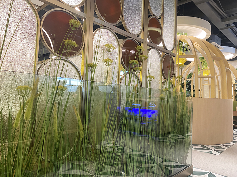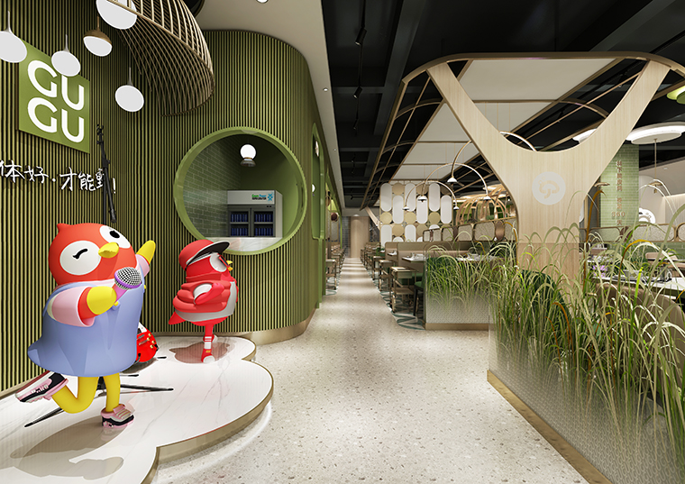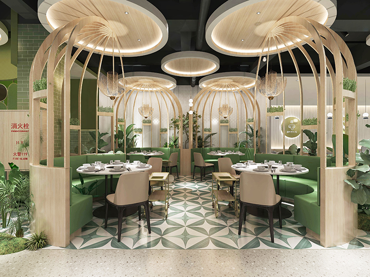 為了營造自然,清新,通透的空間感受,體現(xiàn)咕咕豬肚雞清湯養(yǎng)生特點,品深餐飲裝飾設(shè)計團隊使用了淺木色半包鳥籠造型,隔斷中遍種仿真綠植,墻面以淺白色手工磚突出了發(fā)光不銹鋼廣告畫面的內(nèi)容,簡約又具有鮮明的廣告效果,很好地將咕咕豬肚雞的品牌文化、品牌形象及品牌內(nèi)容在空間中展現(xiàn)出來了。