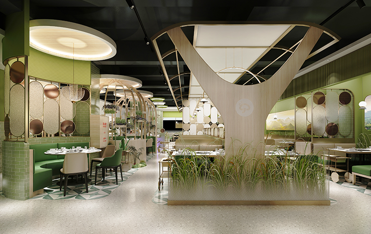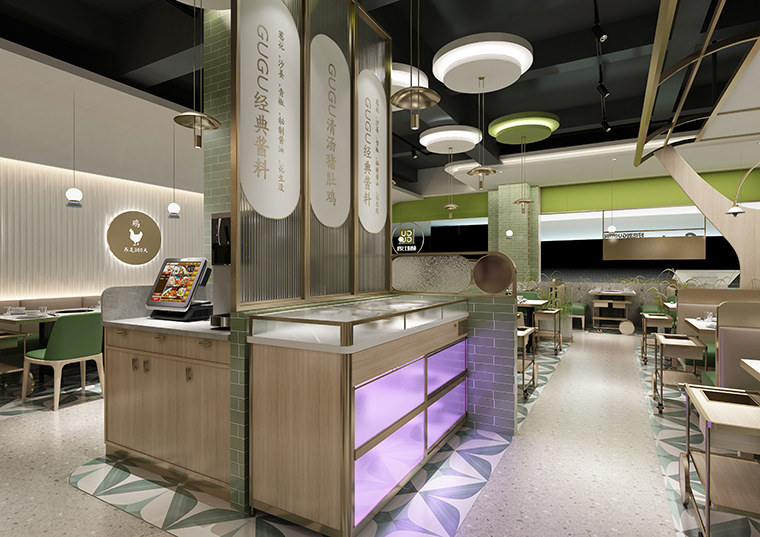 2、用裝飾材料特性表現(xiàn)豬肚雞菜品的核心特征,打造出時尚清新,通透舒適的空間感受。