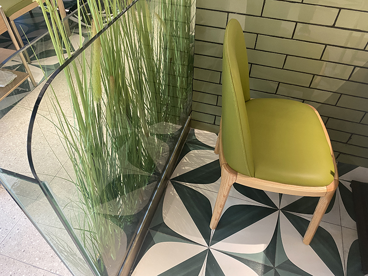我們想到了磨砂玻璃這一材質(zhì),在餐廳立面的隔斷、包間的墻體,我們使用了磨砂玻璃及玻璃方磚,這種材料在燈光照耀下,有一種晶瑩剔透的感覺,用裝飾材料特性表現(xiàn)菜品清湯這一核心特征,打造出時尚清新,通透舒適的空間感受。